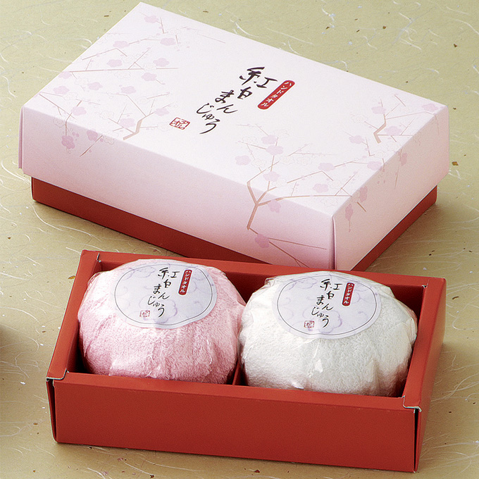 | 縁起物の「紅白まんじゅう」を再現したタオルセット |
